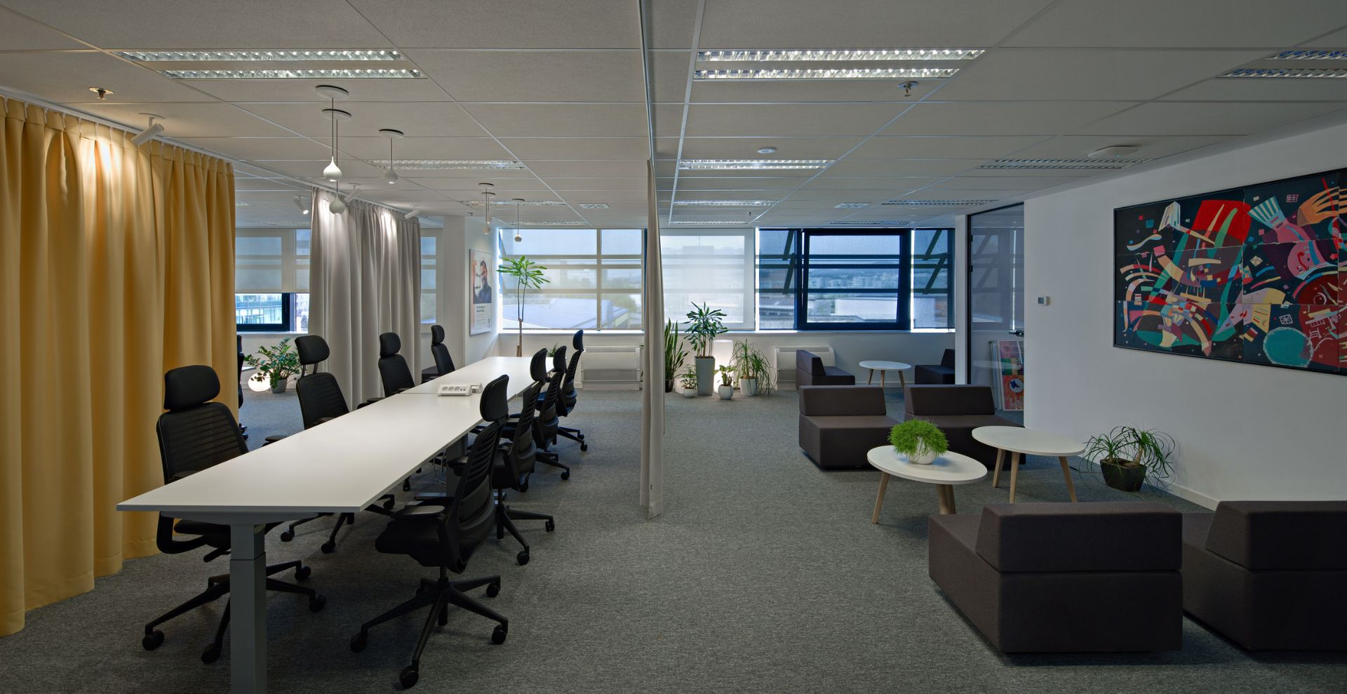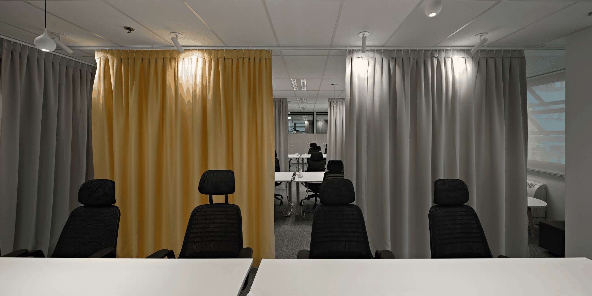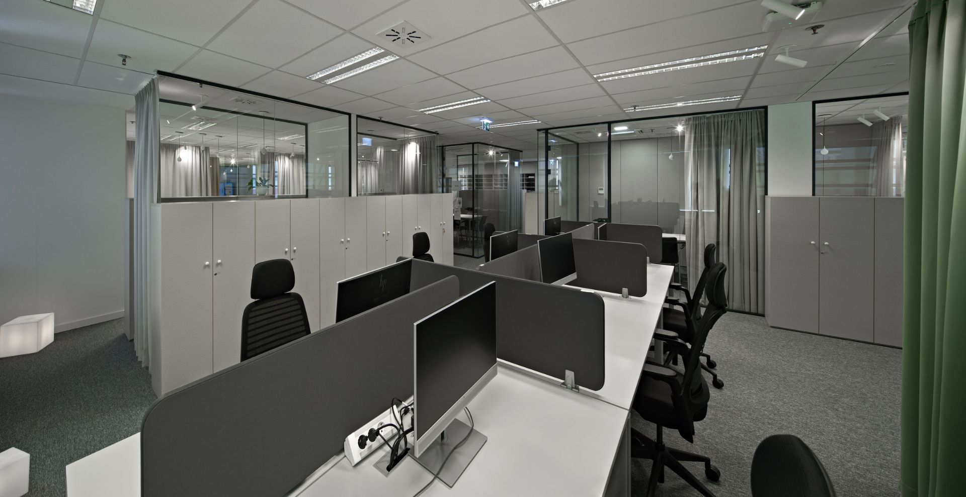 Ured s programom velikog open spacea bez dezigniranih stolova u prostoru sa centralnom jezgrom smo razbili na dijelove odvojene izmaknutim kubusima različite veličine i materijala i color coded zavjesama koje pretvaraju prostore u polivalentne i prilagodljive. Nažalost se iz više sile na trećinu smanjila narudžba projektiranog sobnog bilja i nije se ostvarila ideja o urbanoj džungli.