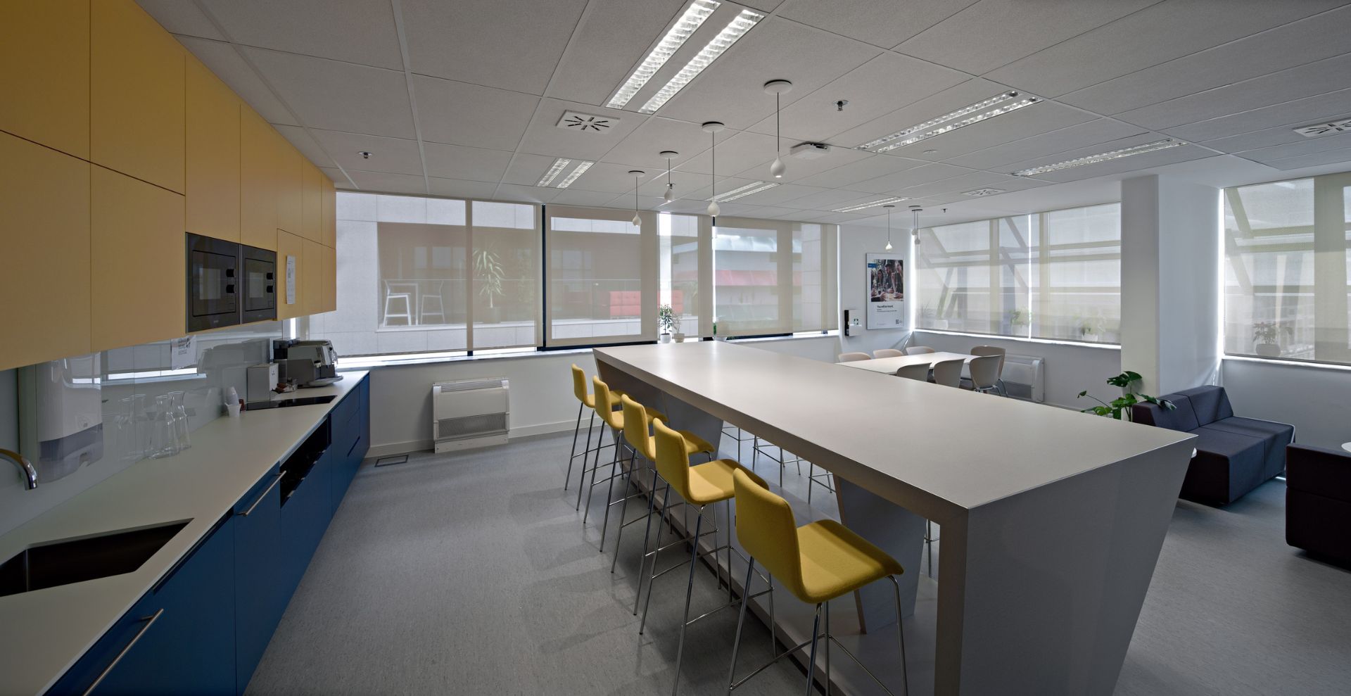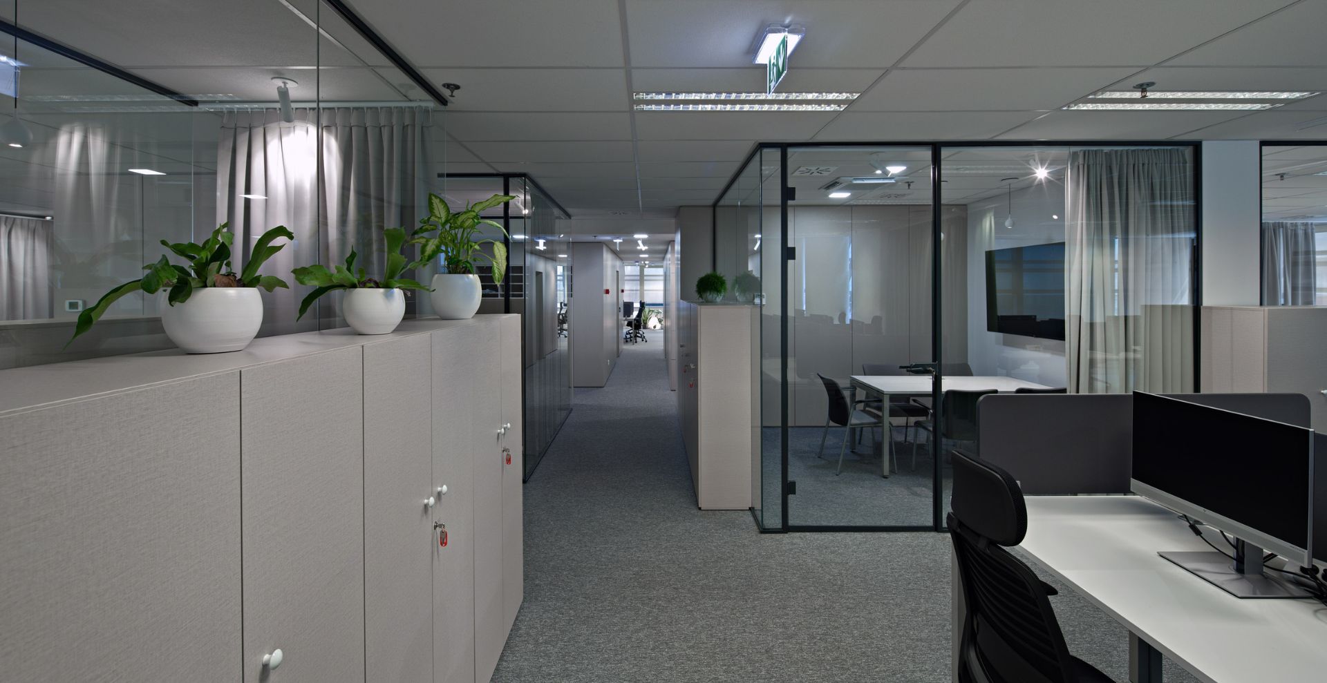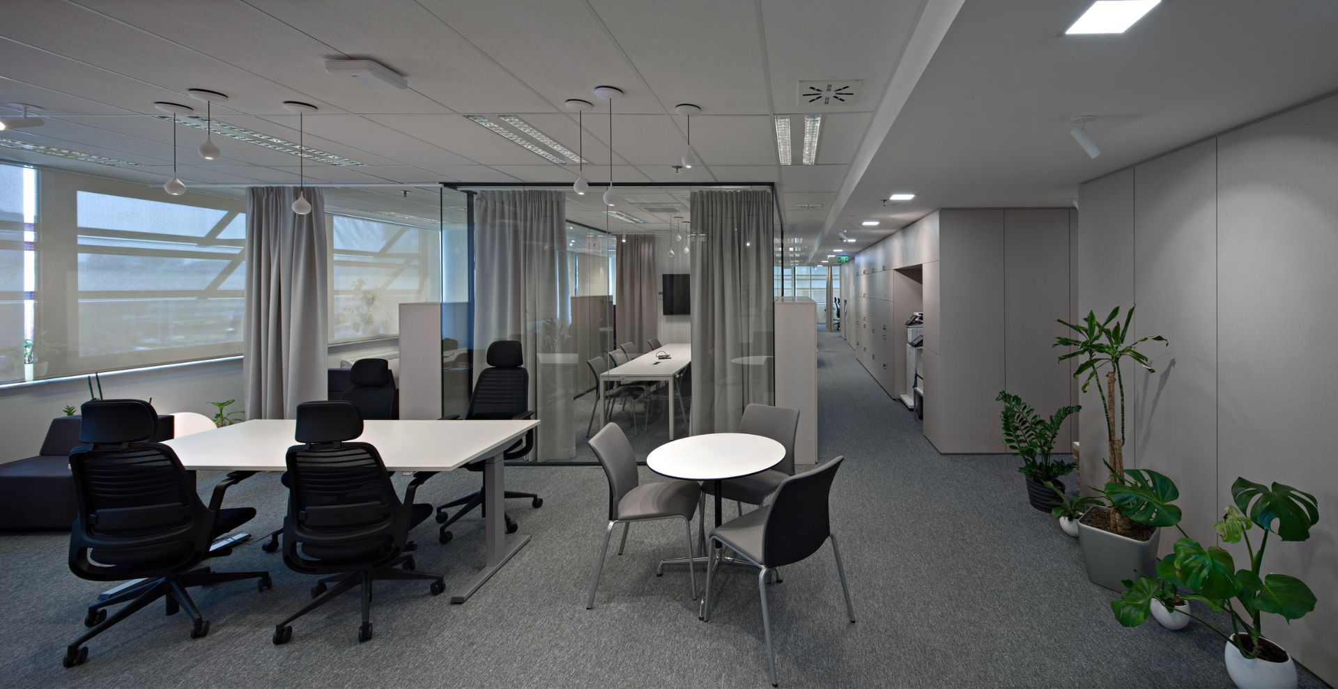 Ured s programom velikog open spacea bez dezigniranih stolova u prostoru sa centralnom jezgrom smo razbili na dijelove odvojene izmaknutim kubusima različite veličine i materijala i color coded zavjesama koje pretvaraju prostore u polivalentne i prilagodljive. Nažalost se iz više sile na trećinu smanjila narudžba projektiranog sobnog bilja i nije se ostvarila ideja o urbanoj džungli.